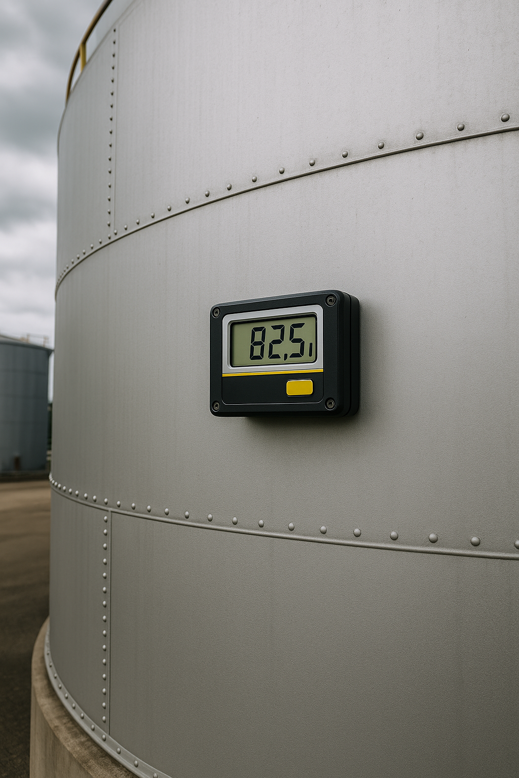 Higrómetro digital instalado en una estructura metálica, mostrando una lectura de 82.5.
