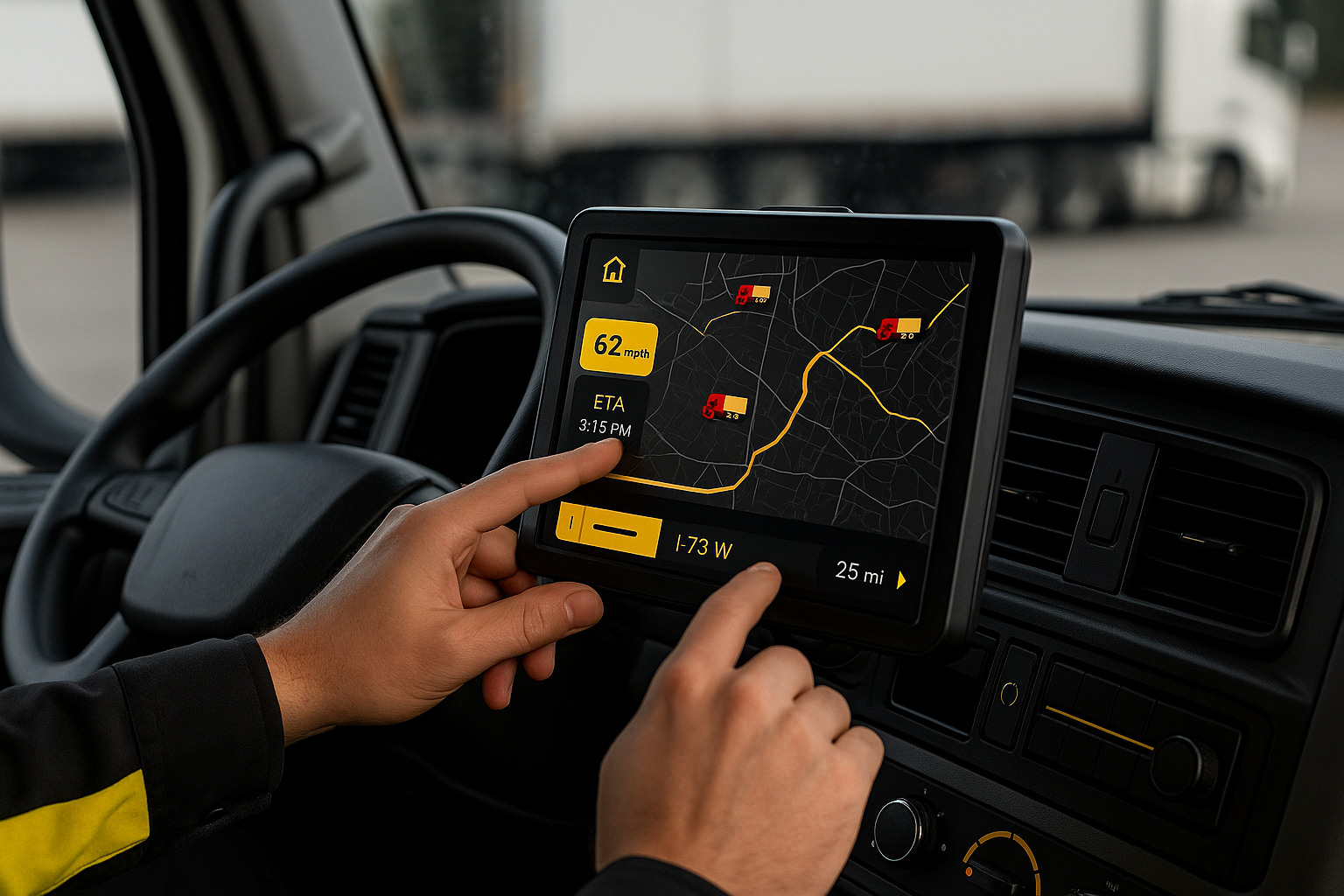Persona usando un sistema de navegación en una pantalla conductora de camión, mostrando un mapa con rutas y velocidad.